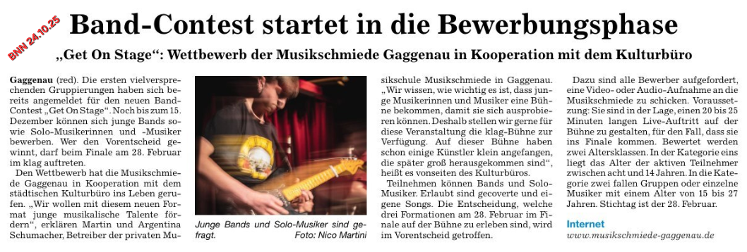 „Get on stage!“ ist der Band-Contest für Gaggenau und Umgebung mit Live-Finale am 28.02.2026 auf der klag-Bühne in Gaggenau. Ziel ist die Förderung und Motivation junger, musikalischer Talente. Veranstalter ist die private Musikschule „Musikschmiede Gaggenau“ in Kooperation mit dem Kulturbüro der Stadt Gaggenau.